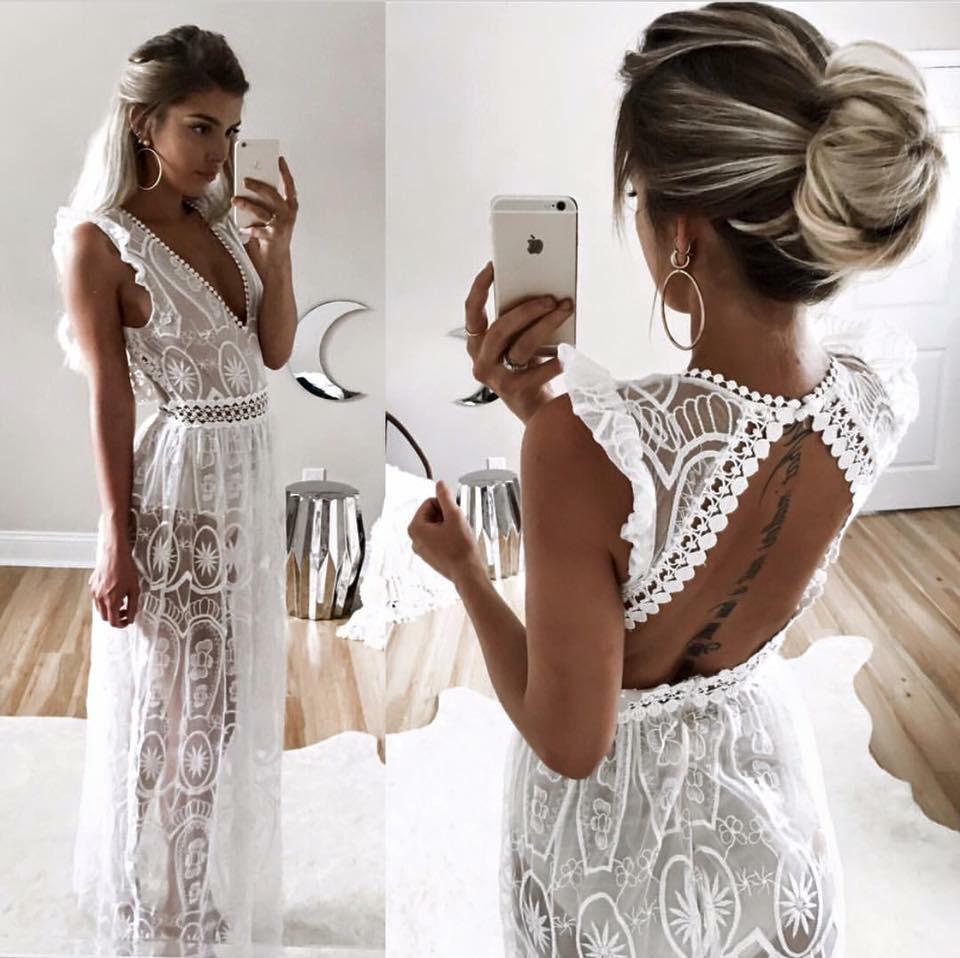 A gorgeous sheer lace maxi dress with open back and soft ruffles on the shoulder. The inbuilt nude bodysuit fits comfortably and creates a flirty feminine look that really show off the crochet detail throughout. The perfect choice for day or night.