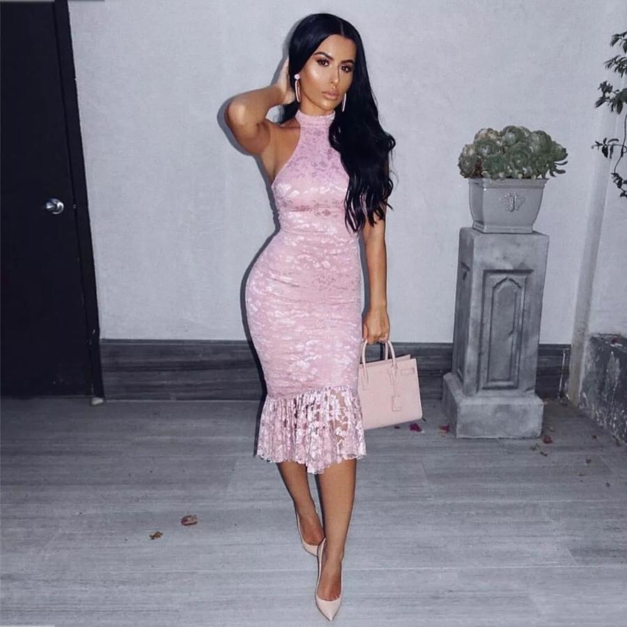 Bittersweet - Pink lace bandage dress, with halter neck design