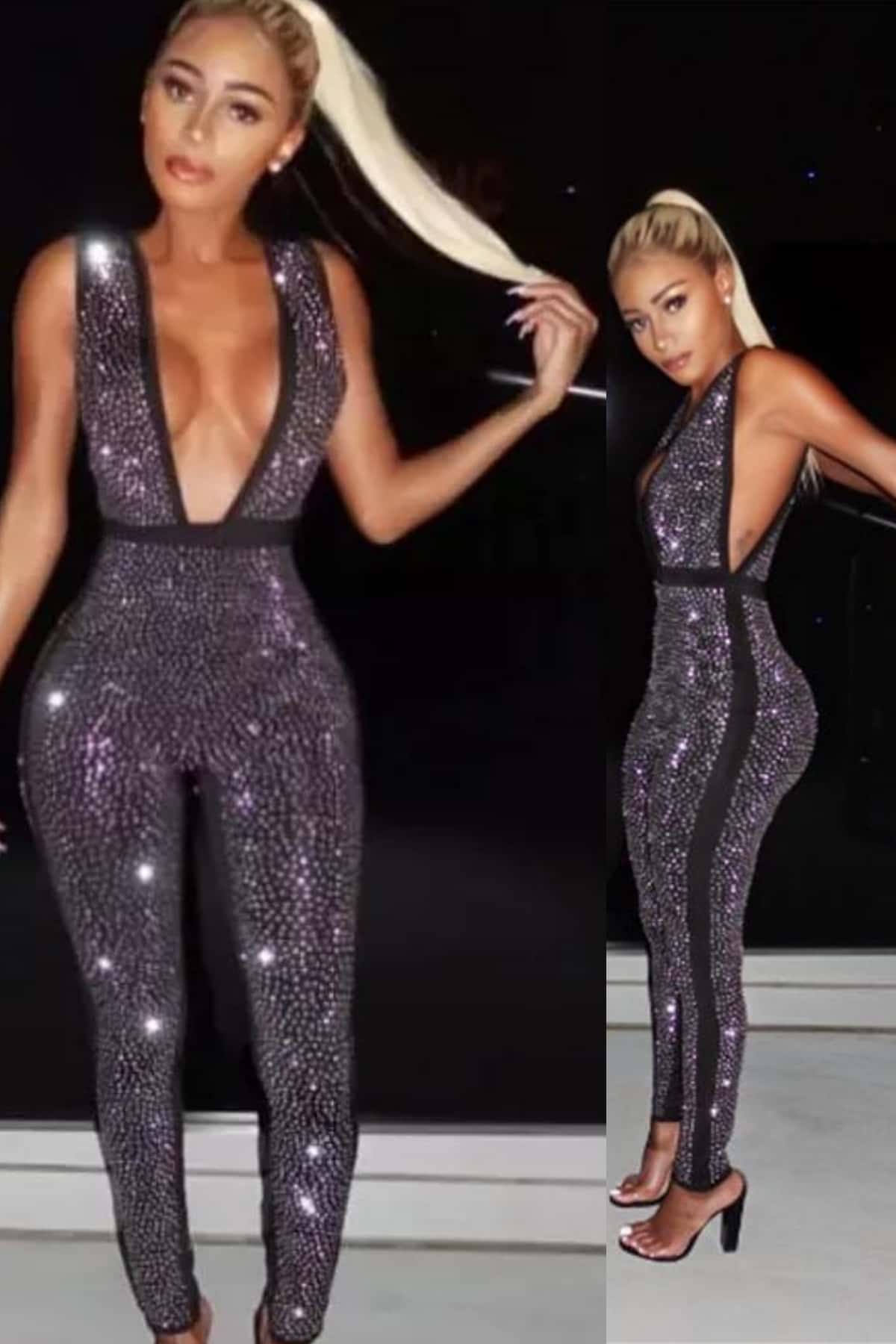 This eye-catching jumpsuit was made for anyone who loves to make a statement with their fashion. The plunging neckline and low open back are perfectly highlighted by the thousands of crystals that beautifully catch the light as you hit the night on the town.