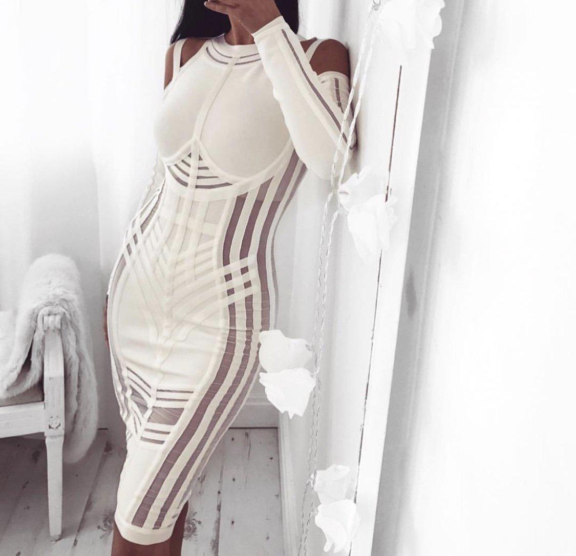 This product is available for 24HR overnight postageGalaxy white bodycon dress with mesh panels, bandage material, with hidden back zipper
