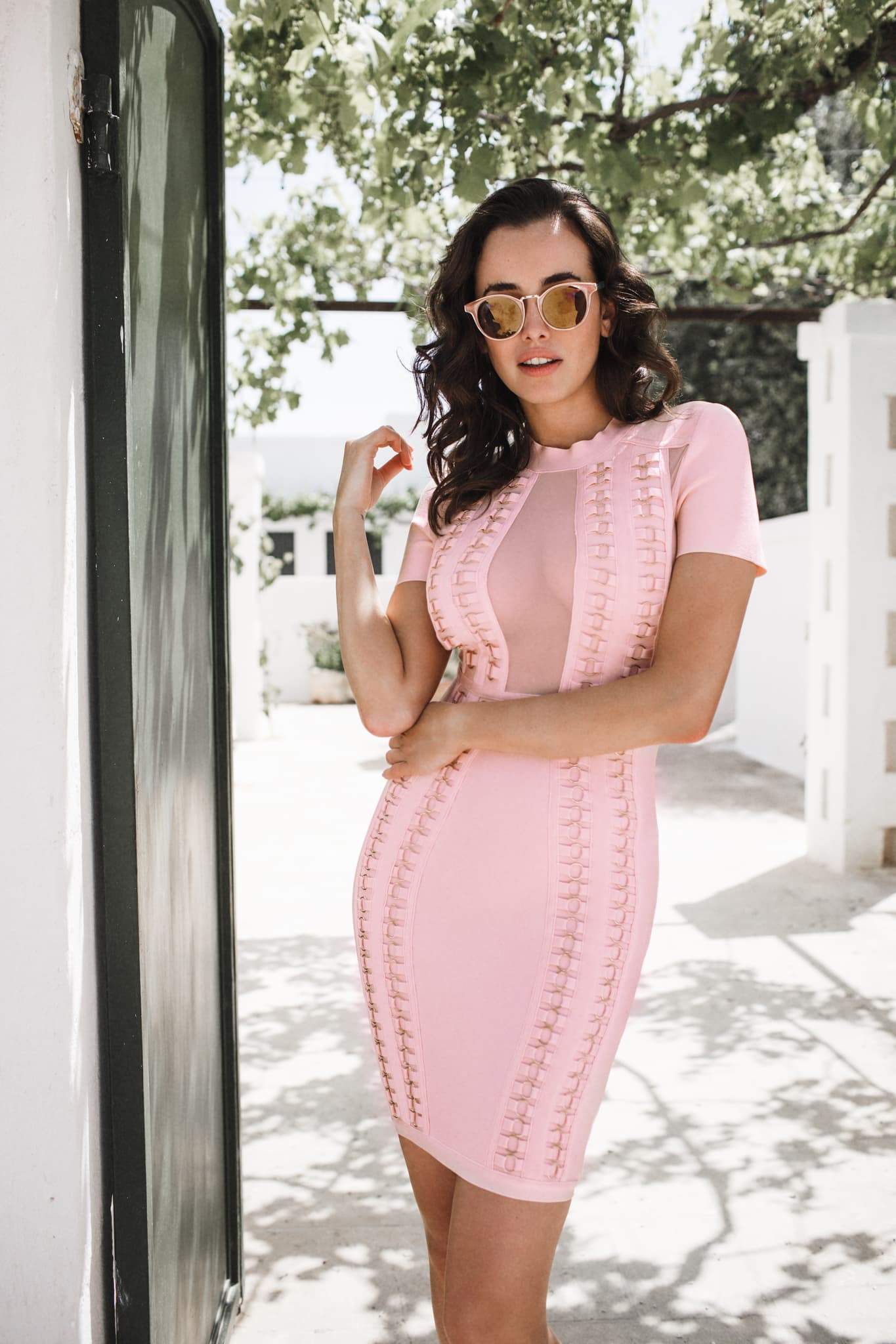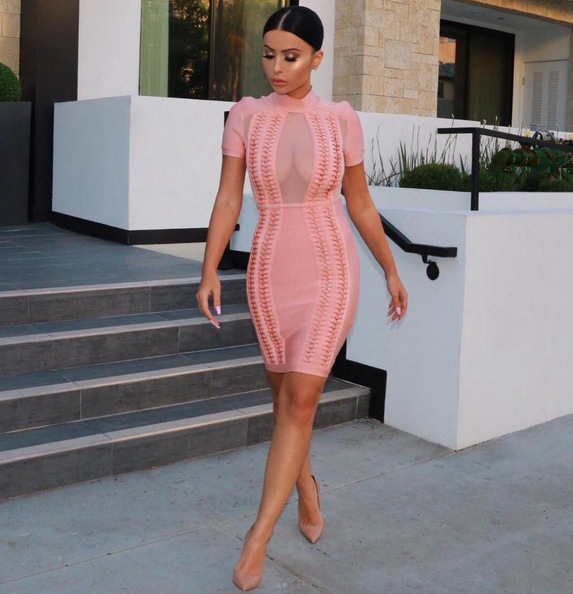 pastel tones with gold hardware design mesh bandage dress.