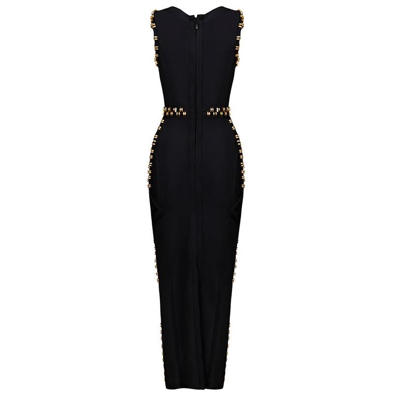 Stunning fitted black bandage bodycon dress with gold metal accents. Also available in white with gold metal accents. Made of stretch fabric, rayon, spandex and nylon.